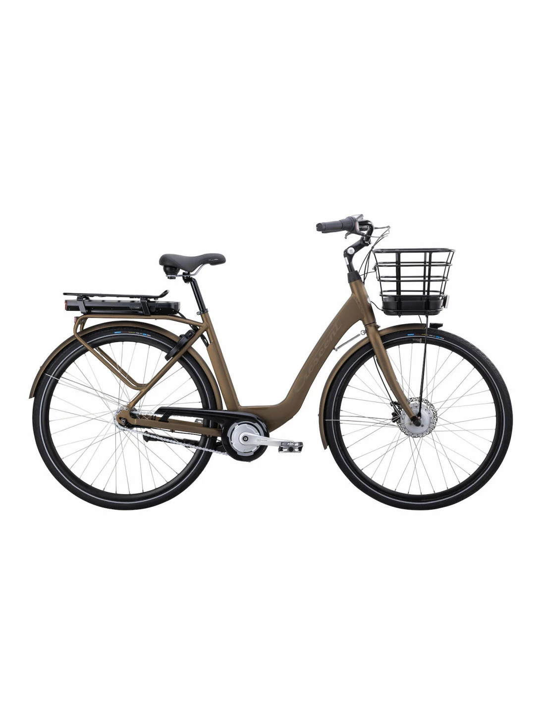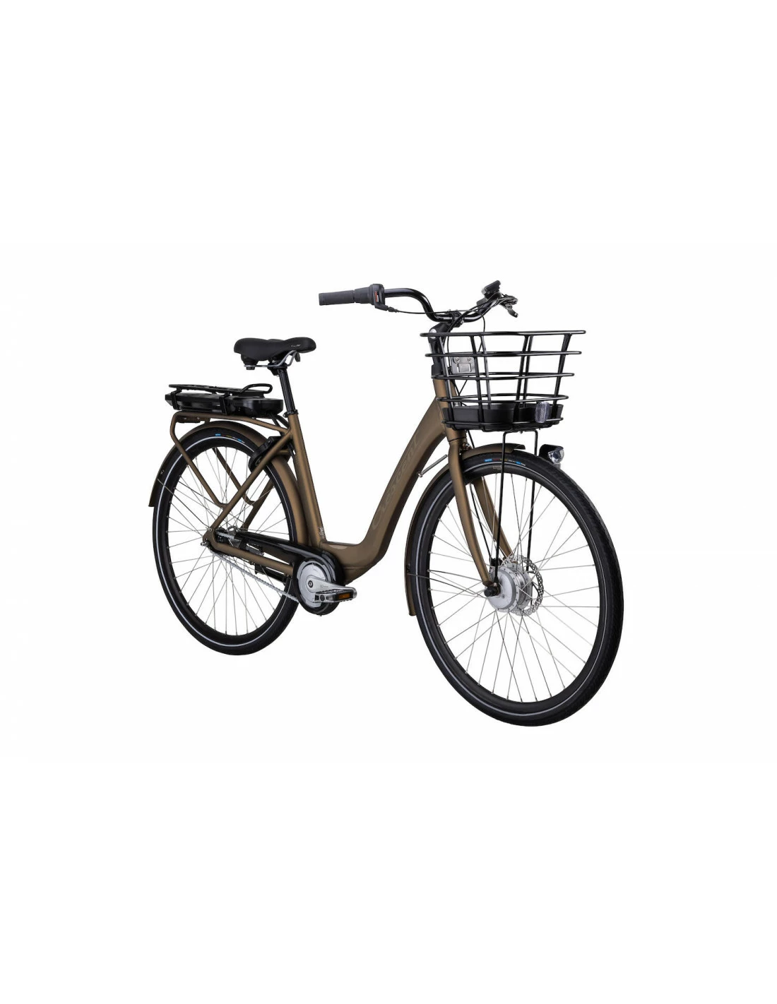 Denna cykel har ett pakethållarbatteri på 417 wh som du kan plocka ur cykeln och ta med dig. Din återförsäljare kan hjälpa dig att låsa batteriet så att det bara fungerar med din cykel och ställa in cykelns körstil så att den driver på ett sätt som passar din cykling. Allt är snyggt inbyggt i en 7-växlad damcykel av modernt snitt, med lågt insteg, fotbroms bak och skivbroms fram. Displayen på styret håller dig uppdaterad när du och cykelns batteri sitter i pakethållaren, som dessutom har en smart funktion där du enkelt klickar av och på en väska eller korg. Cykelkorg med anpassad tygväska framtill ingår, liksom stöd, godkänt ramlås och belysning.