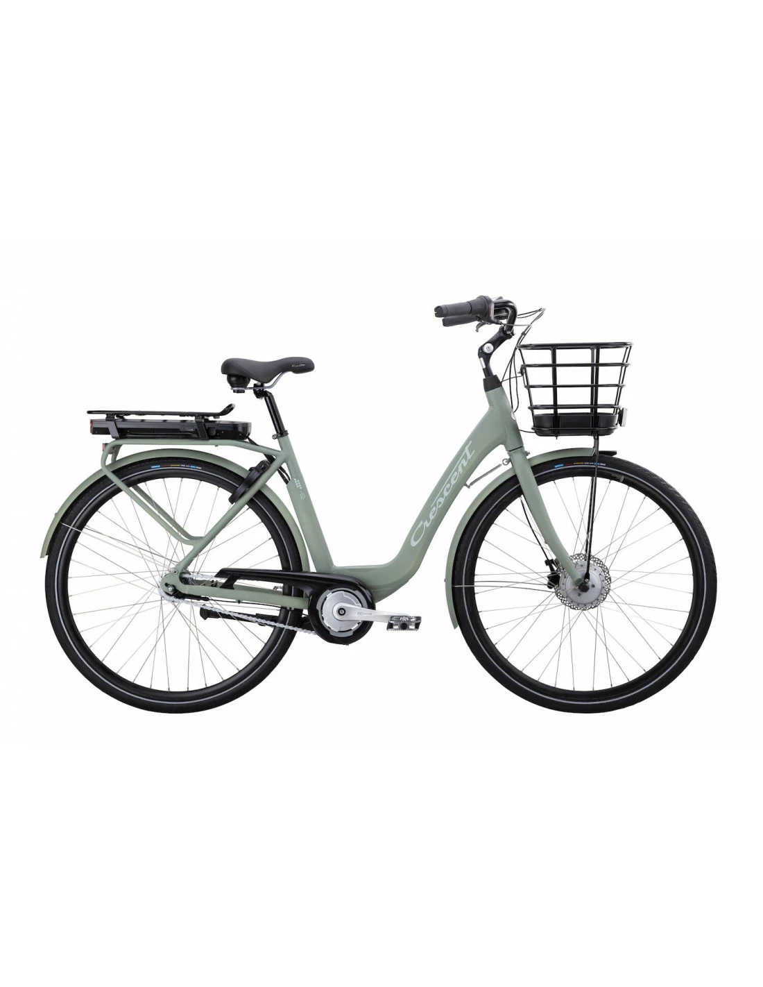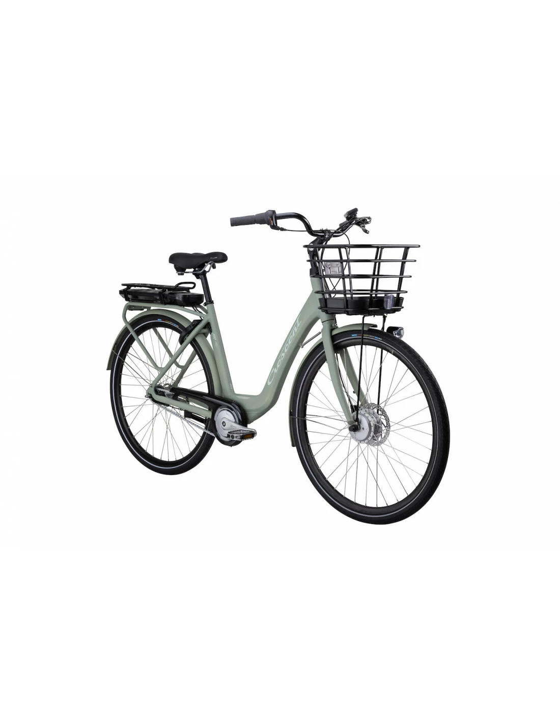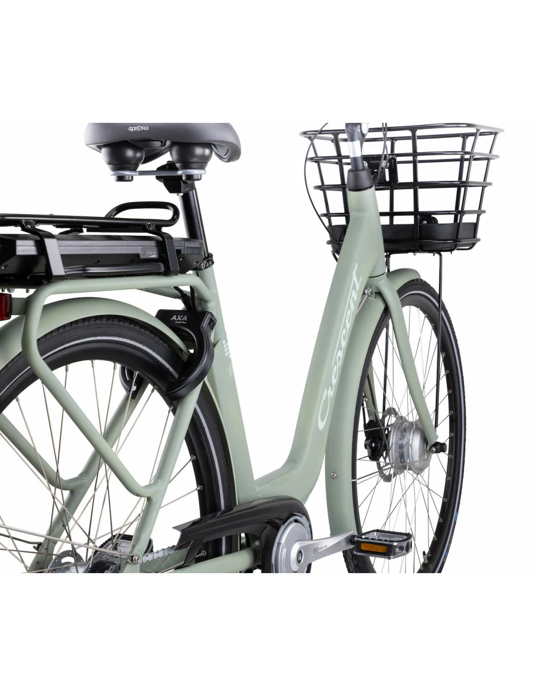 Denna cykel har ett pakethållarbatteri på 417 wh som du kan plocka ur cykeln och ta med dig. Din återförsäljare kan hjälpa dig att låsa batteriet så att det bara fungerar med din cykel och ställa in cykelns körstil så att den driver på ett sätt som passar din cykling. Allt är snyggt inbyggt i en 7-växlad damcykel av modernt snitt, med lågt insteg, fotbroms bak och skivbroms fram. Displayen på styret håller dig uppdaterad när du och cykelns batteri sitter i pakethållaren, som dessutom har en smart funktion där du enkelt klickar av och på en väska eller korg. Cykelkorg med anpassad tygväska framtill ingår, liksom stöd, godkänt ramlås och belysning.