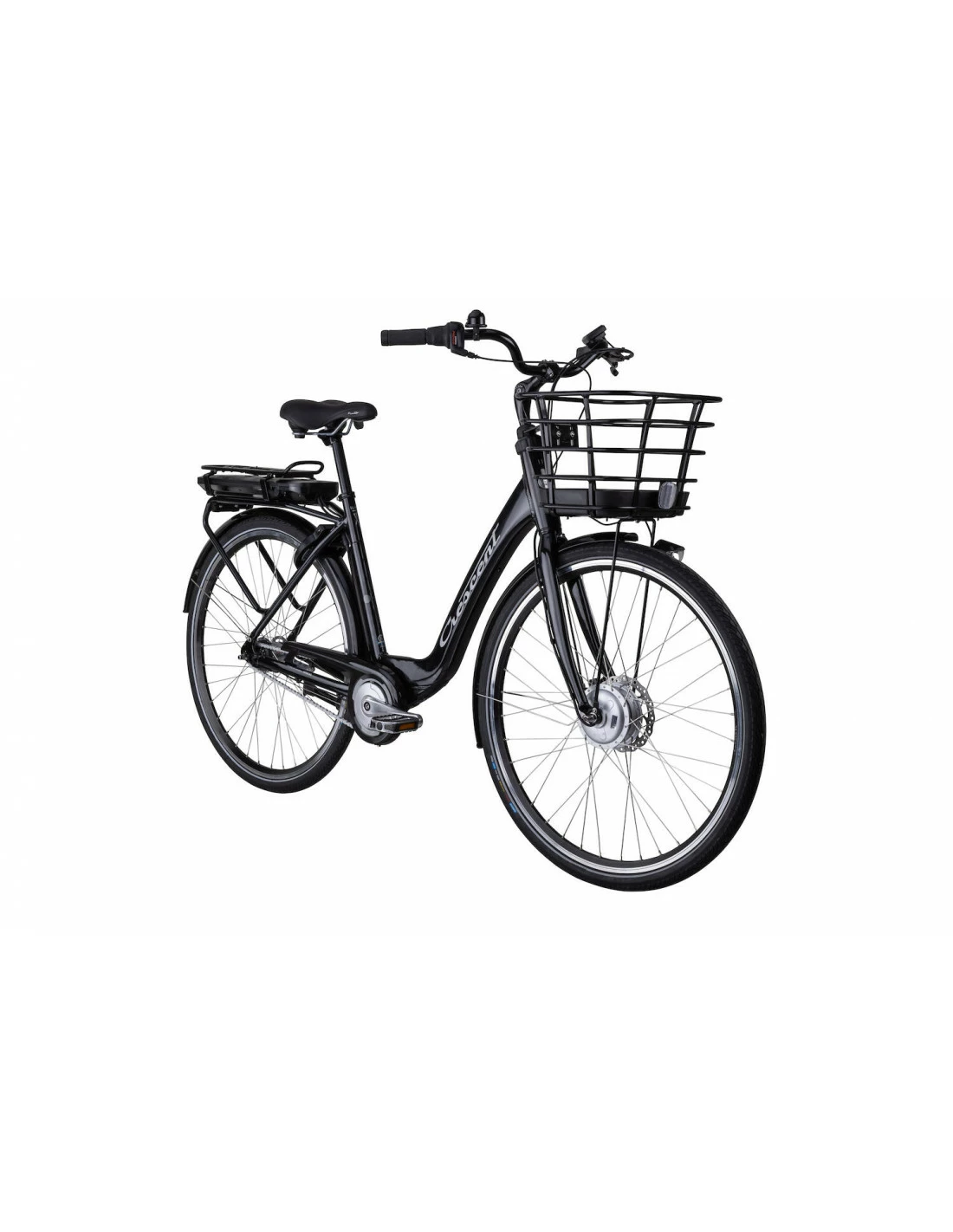 Allt är snyggt inbyggt i en 7-växlad damcykel av modernt snitt, med lågt insteg, fotbroms bak och skivbroms fram. Displayen på styret håller dig uppdaterad när du cyklar och cykelns batteri sitter i pakethållaren, som dessutom har en smart funktion där du enkelt klickar av och på en väska eller korg.