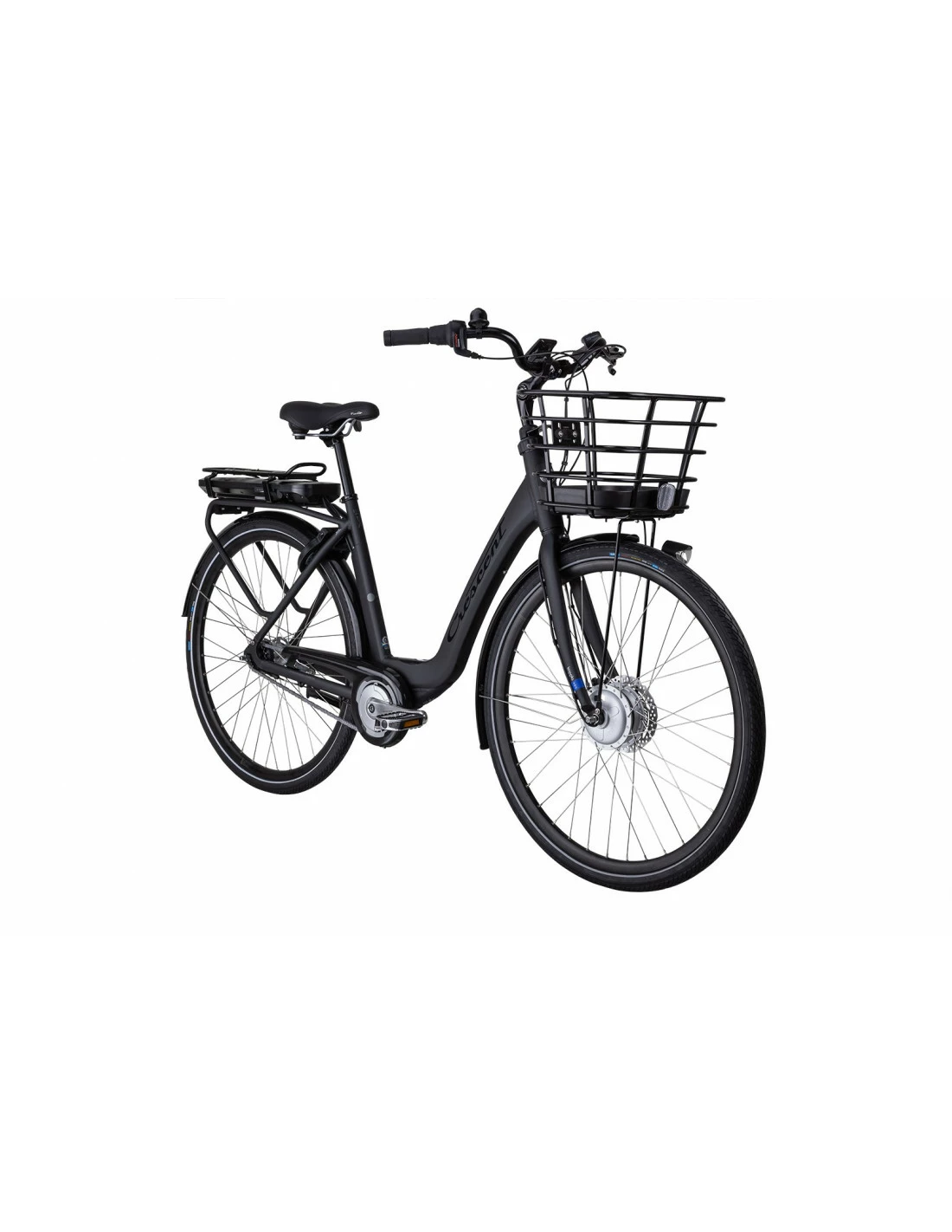 Allt är snyggt inbyggt i en 7-växlad damcykel av modernt snitt, med lågt insteg, fotbroms bak och skivbroms fram. Det ingår också ett styrlagerlås som gör att styret kan hållas upprätt vid parkering även om korgen är fullastad. Displayen på styret håller dig uppdaterad och cykelns batteri sitter i pakethållaren, som dessutom har en smart funktion där du enkelt klickar av och på en väska eller korg. Cykelkorg med anpassad tygväska framtill ingår, liksom stöd, godkänt ramlås och belysning.