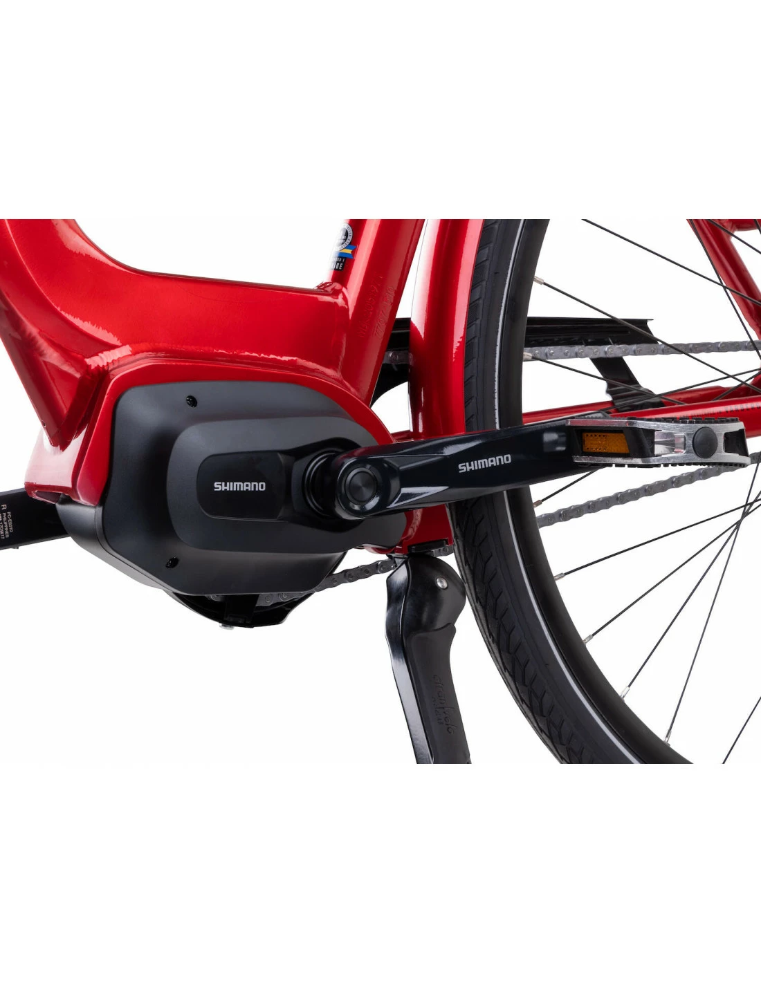 Med Elsa tar du dig fram snabbt och smidigt, oavsett vart du ska. En stark och mjukt spinnande centermotor från Shimano som gör cykelupplevelsen till något alldeles speciellt. Den hjälper dig vid start, uppför backar, i motvind eller när du promenerar bredvid med hjälp av batteriet på 400 Wh. Systemet känner av ditt pedaltryck och anpassar effekten därefter. Vilken nivå av hjälp du vill ha bestämmer du med en knapptryckning på styret, och det är precis lika enkelt som att byta växel. Ramens låga insteg gör det enkelt att kliva på, och av. Frampakethållaren och den robusta pakethållaren bak är utrustade med AVS-systemet som gör det möjligt att klicka på AVS-väskor eller AVS-korgar både fram och bak. På styret sitter en display som visar vald effekt, hastighet, batteriets laddnivå och hur långt den kraften kan ta dig. Batteriet är enkelt att ta loss. Fullt utrustad elcykel med stöd, godkänt ramlås och belysning.
