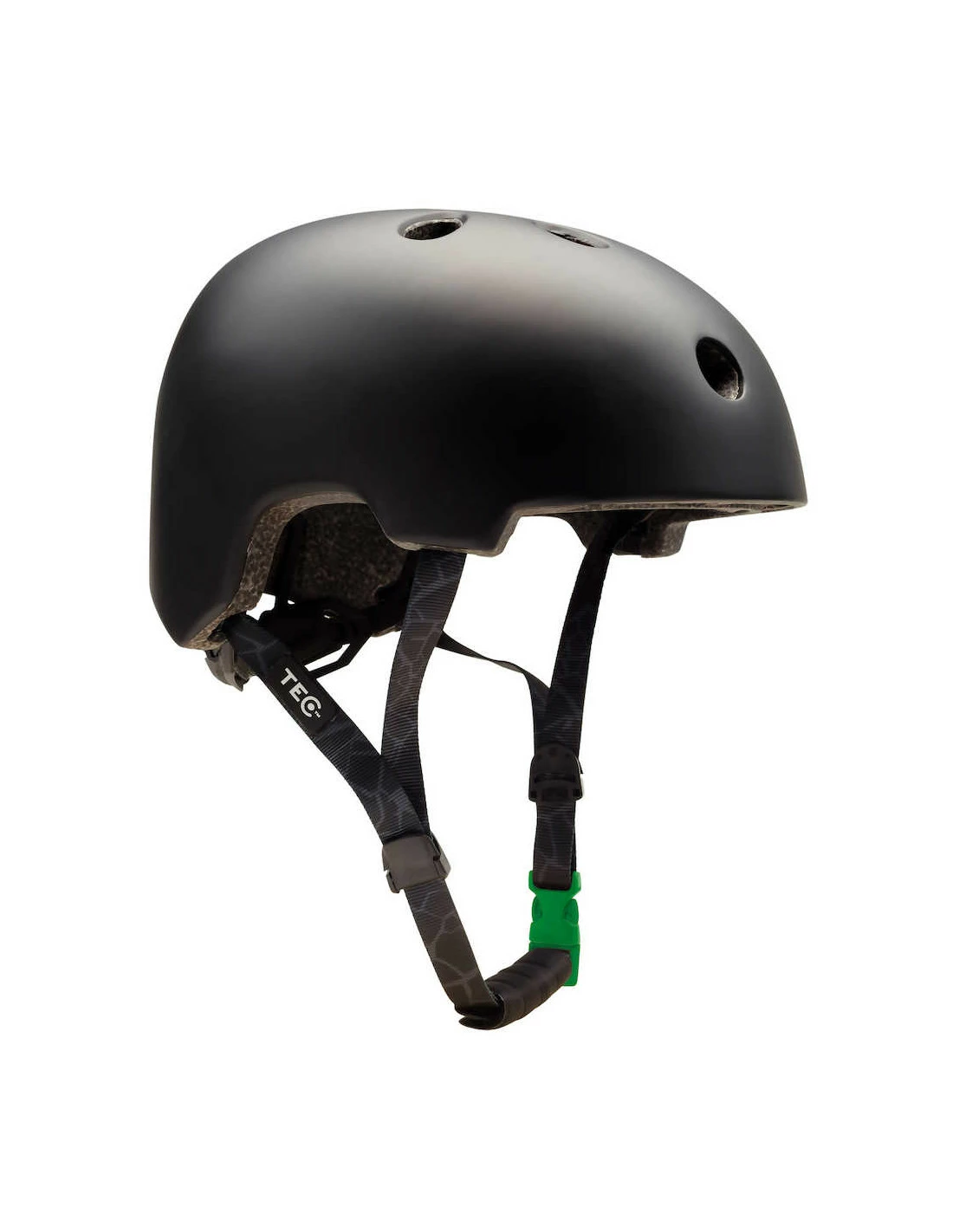 Tuff skatehjälm för barn och junior. Minsta storleken är utrustad med grönt spänne. Inmouldteknik ger en lätt hjälm med bra skydd. Ett yttre hårt lager skyddar för kanter och vassa föremål och EPSen som sitter ihop med det yttre skalet tar upp stötar. Twist nacksystem för enkel storleksjustering.